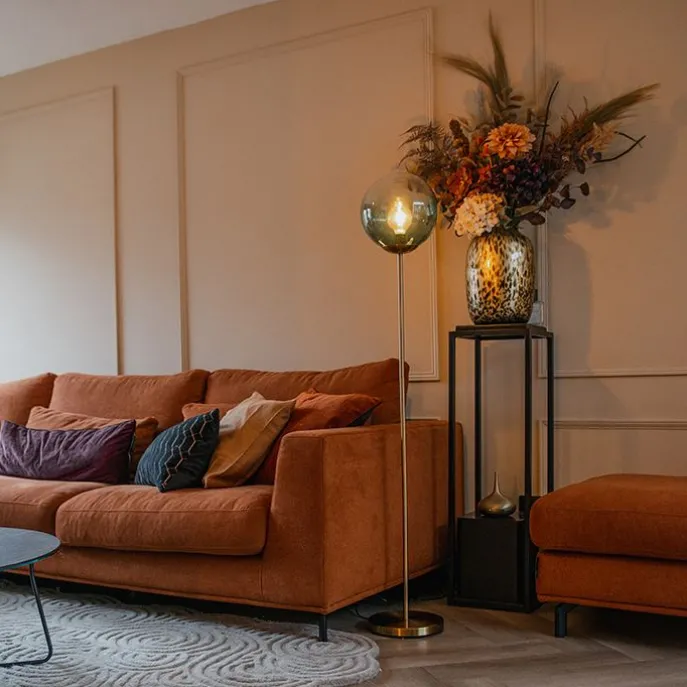Haal een leuke Art Deco sfeer in huis met onze messing vloerlamp. Pallon Mezzi is afgewerkt in messing met lichtgroen glas wat zorgt voor gezellig sfeerlicht. Een echte eyecatcher! Deze vloerlamp steelt de show in de woonkamer of in de hal. Het is ook een leuke sfeerlamp in de slaapkamer. De diameter van de voet is 25 cm en de vloerlamp heeft een totale hoogte van 143 cm. Het bijgeleverde snoer heeft een lengte van 250 cm. Je maakt onze Pallon Mezzi compleet met een E27 lichtbron (max. 40 Watt). Deze lichtbron is niet inbegrepen. Je kan hem in de avond dimmen met een externe dimmer (niet inbegrepen); maak het gezellig met onze Pallon Mezzi in huis!