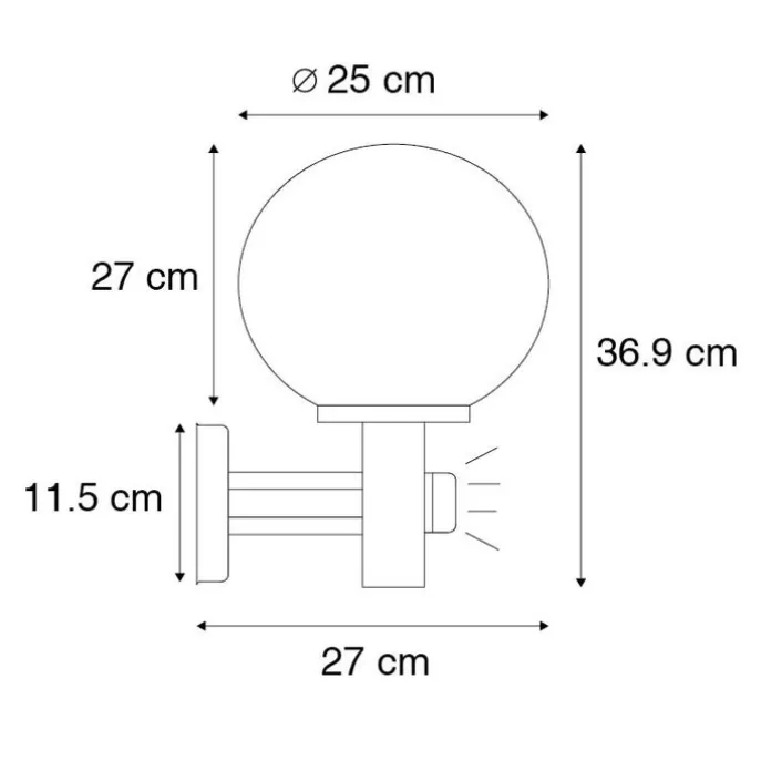 Stevige en eenvoudige moderne buitenwandlamp afgewerkt in staal met een opalen kap. De Sfera is sterk en duurzaam waardoor het een ideale wandlamp is voor elk gebied in je tuin of buitenruimte om sfeer te creëren. Hij beschikt over een bewegingsmelder waardoor hij beweging detecteert. Zo springt hij aan wanneer je in de buurt komt, of het schrikt ongenodigde gasten meteen af. Een handig lampje!Deze wandlamp is compact van formaat, heeft een totale hoogte van 38 cm en een diameter van 25 cm. De lamp heeft IP44 waardoor hij perfect is om buiten of in de badkamer te gebruiken. Je maakt de lamp af met een lichtbron met een E27 fitting (max. 60 Watt), deze moeten wel nog los bijbesteld worden. Verlicht je buitenwand met de Sfera!