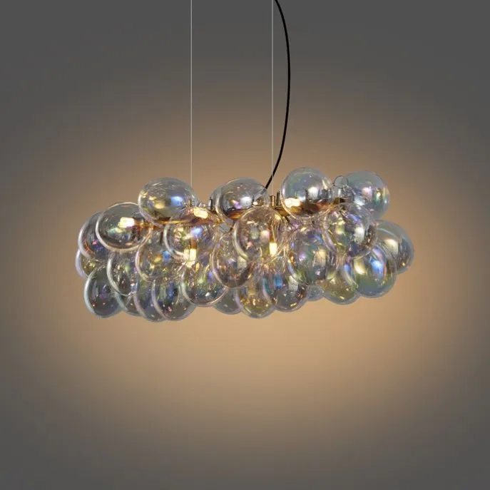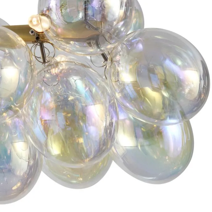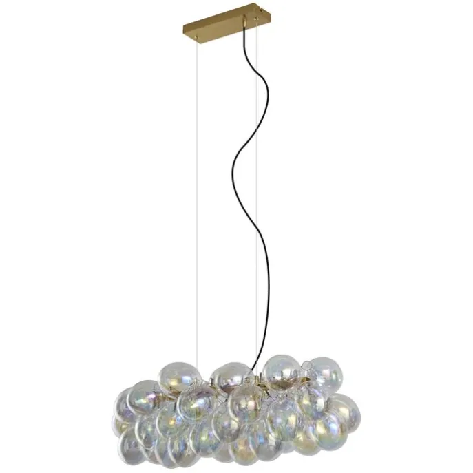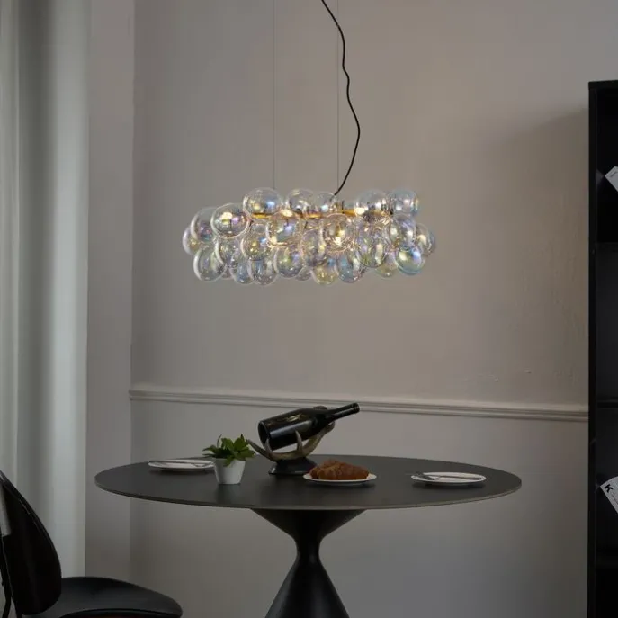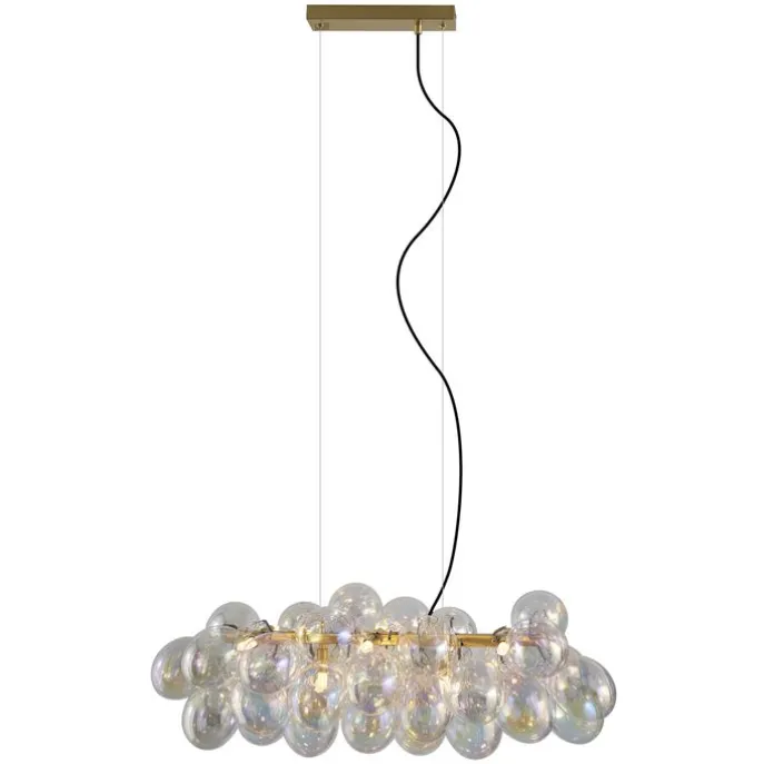 Laat je interieur schitteren met een vleugje magieDeze betoverende hanglamp uit de Uvas-serie is allesbehalve alledaags. Met haar gouden afwerking en regenboogkleurig glas brengt ze een speels kleurenspel in elke ruimte. De acht lichtpunten zorgen niet alleen voor een warme, uitnodigende sfeer, maar maken van deze lamp ook een echte blikvanger boven je eettafel of in de woonkamer.Wat deze lamp zo bijzonder maakt? Het regenboogglas vangt het licht op een unieke manier, waardoor elke hoek van de kamer subtiel oplicht met een vleugje kleur.