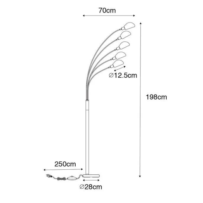 Fris jouw interieur op met vloerlamp Sixties. Doordat hij gemaakt is van staal met steen/beton en is afgewerkt in het brons met goud/messing, is het een echte must-have voor een design interieur. De vijf lichtpunten kun je onafhankelijk van elkaar instellen! Deze vloerlamp heeft een lengte van 70 cm, breedte van 28 cm en een hoogte van 198 cm. Vergeet de lichtbronnen met een E14 fitting er niet nog los bij te bestellen. Deze worden niet meegeleverd. Deze lamp komt met een snoer en stekker. Het snoer is 250 cm lang. Sixties is dimbaar, dimmer is niet inbegrepen. Naar deze vloerlamp blijf je maar staren: Sixties mag niet ontbreken in jouw interieur!