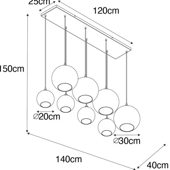 Wauw wat een toffe hanglamp is Sandra! De verschillende bollen zorgen voor veel dynamiek in de ruimte. De hanglamp is gemaakt van glas met staal, de montageplaat is afgewerkt in messing. De bollen hebben een blauw en groen effect. Dat zorgt voor meer sfeer in de ruimte wanneer de verlichting aan staat! Sandra heeft een lengte van 140 cm en breedte van 40 cm. De hanglamp is verstelbaar in hoogte van max. 150 cm tot minimaal 60 cm. 4 glazen bollen hebben een diameter van 20 cm en de andere 4 hebben een diameter van 30 cm. De montageplaat heeft een hoogte van 2,5 cm, lengte van 120 cm en breedte van 25 cm. Het snoer heeft een lengte van 199,5 cm. Je maakt de hanglamp af met een lichtbron met E27 fitting van max. 60 watt. Vergeet deze er dus niet nog los bij te bestellen. Maak jouw woonkamer, eetkamer of kantoor af met hanglamp Sandra.