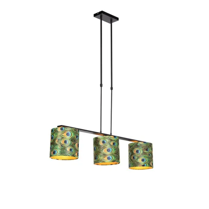 Ben je op zoek naar de ideale combinatie tussen uniek en tijdloos? Dan is deze Combi precies wat je zoekt. Een erg stijlvolle hanglamp. De drie velours lampenkappen (diameter van 20 cm) in pauwenprint zorgen voor een echte eyecatcher. Maak je woonkamer, keuken of eetkamer compleet met deze hanglamp. Kies drie leuke lichtbronnen (passend in een E27 fitting) van elk max. 40 Watt. Deze lamp is dimbaar met een externe dimmer, maak het dus extra gezellig! Hij is tevens verstelbaar in hoogte: een maximale hoogte van 125 cm en minimum 85 cm. Bepaal dus zelf de hoogte van jouw unieke hanglamp!