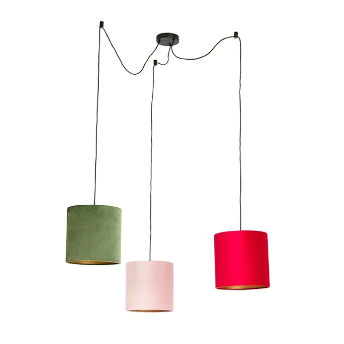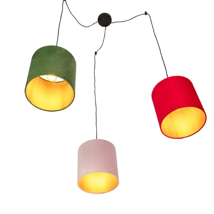 Hanglamp met velours kappen rood, groen en roze – Cava