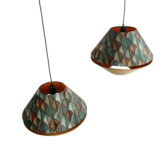 Hanglamp zwart met dubbele velours lampenkap blad dessin en beige 2-lichts – Cava Luxe