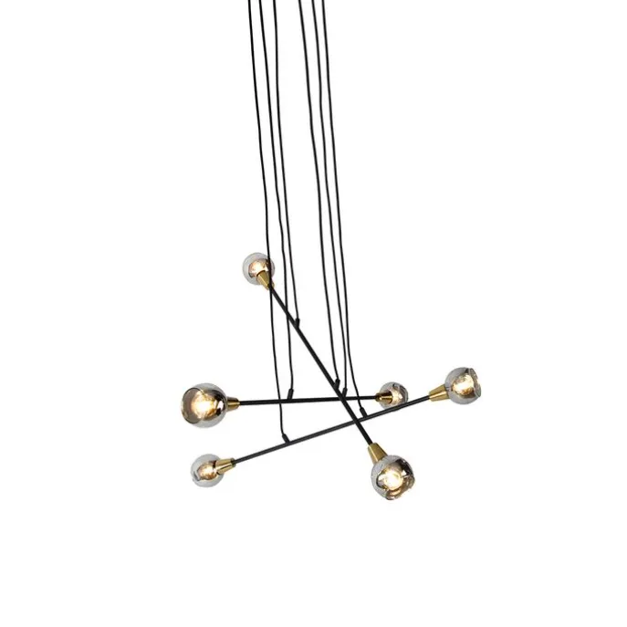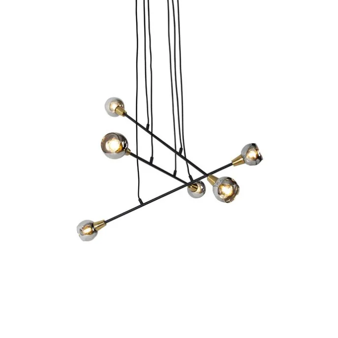 Hanglamp zwart met messing en smoke glas 6-lichts – Vidro