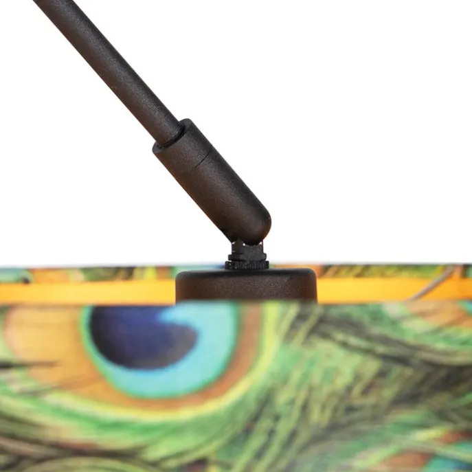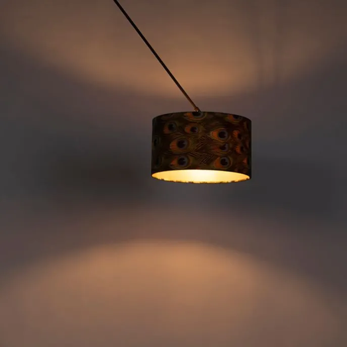 Stoere vorm, romantische kap! Dat is de Blitz hanglamp. De lamp heeft een totale hoogte van 130 cm. De montageplaat voor aan het plafond heeft een diameter van 10 cm. De lamp is afgemaakt met een velours kap met pauwenprint. Hij heeft een diameter van 35 cm. Leuk extraatje aan deze kap is de gouden binnenkant, dat zorgt voor een mooi lichteffect! In je slaapkamer, woonkamer of in je hal voelt hij zich meteen thuis.Maak je hanglamp compleet met een leuke lichtbron passend in een E27 fitting (max. 60 watt). De lamp is tevens dimbaar met een externe dimmer; een extra gezellige sfeer in de avond met de Blitz.Met deze hanglamp kies je voor romantisch en stoer in je interieur.