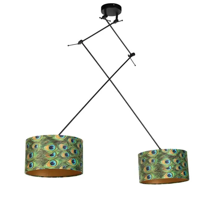 Hanglamp zwart met velours kappen pauw met goud 35 cm 2-lichts – Blitz