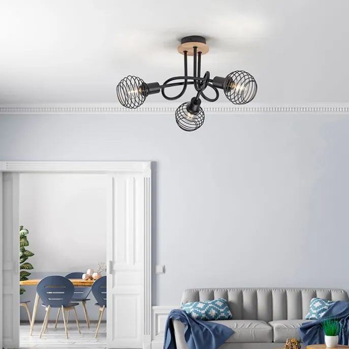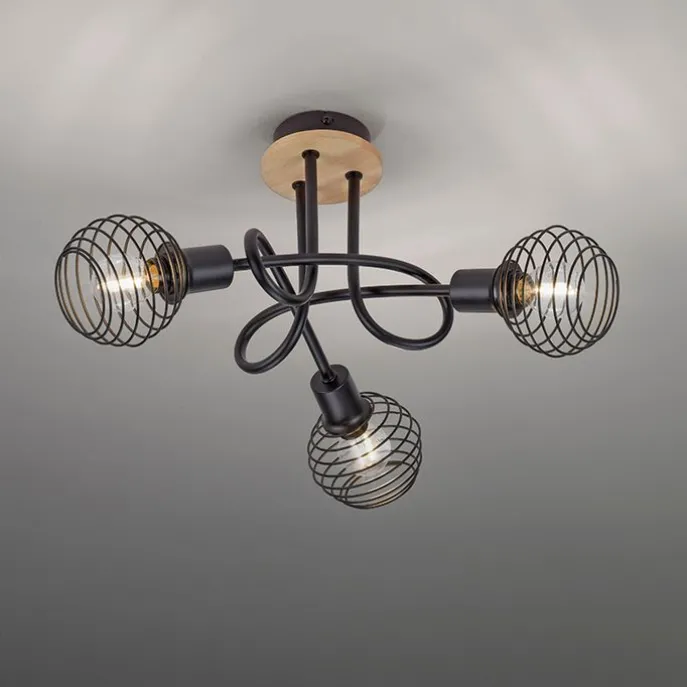 Industriële plafondspot zwart met hout 3-lichts – Winsten