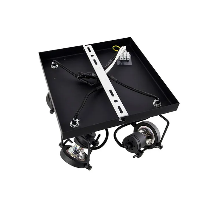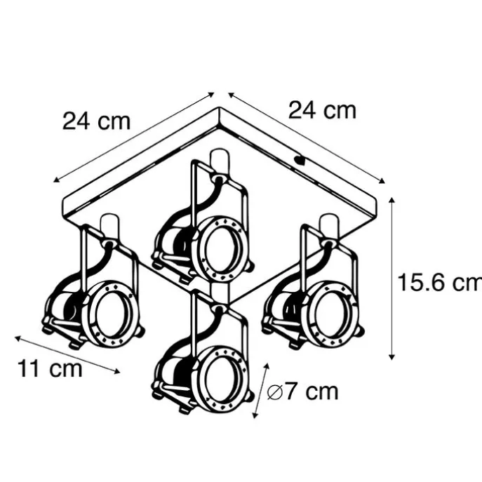 Deze stoere spots passen super goed in een industrieel interieur. Of heb jij juist een modern interieur, maar wil je er een robuuste touch aan toevoegen? Dan is Suplux de lamp voor jou.Spot Suplux is een vierkante zwart stalen spot met maar liefst 4 lichtpunten. Hij heeft een hoogte van 15,6 cm, een lengte van 24 cm en een breedte van 24 cm. De montageplaat heeft een hoogte van 2,5 cm, een lengte van 24 cm en een breedte van 24 cm. De kappen hebben een diameter van 7 cm en een hoogte van 11 cm. De lichtbronnen zijn exclusief, deze moet je er dus nog even bij bestellen. Ga voor vier lichtbronnen met een GU10 fitting (max. 50 watt) en dan is de lamp compleet. Je kunt de lamp prima dimmen met een externe dimmer (niet inbegrepen), dus hij is ideaal voor zowel functioneel licht als sfeerlicht.Mag deze stoere spot bij jou aan het plafond hangen?