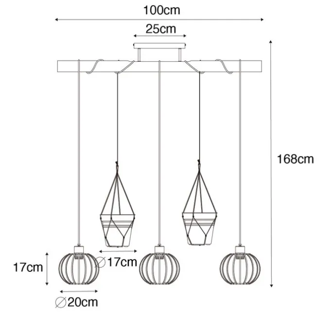 Plant eruit, lamp erin? Zeker niet met Yura. Deze hanglamp geeft je de optie om te genieten van gezellig licht én groen in huis te brengen. Yura heeft een diepte van 20 cm, een hoogte van 168 cm en een lengte van 100 cm. De montageplaat heeft een hoogte van 2,5 cm, een lengte van 25 cm en een breedte van 8 cm. De lamp komt inclusief drie kappen en deze hebben elk een diameter van 20 cm en een hoogte van 17 cm. Extra sfeer in huis? De lamp is dimbaar (dimmer niet inbegrepen). Vergeet niet om nog 3 lichtbronnen met elk E27 fitting (max. 40 watt). los erbij te bestellen. Yura is gemaakt van hout met staal en touw en afgewerkt in het naturel met zwart. Twijfel niet langer en haal Yura snel in huis!
