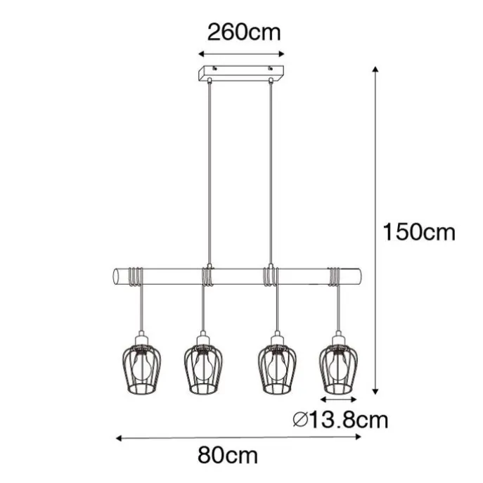 Geef jouw interieur een landelijke touch met hanglamp Stronk. Hij is gemaakt van hout met staal, het staal is afgewerkt in het zwart. De hanglamp lengte van 80 cm, breedte van 13,8 cm en is verstelbaar in hoogte; minimaal 60 cm en maximaal 150 cm. De montageplaat heeft een hoogte van 2,5 cm, lengte van 26 cm en breedte van 8 cm. De kappen hebben ieder een diameter van 13,8 cm en hoogte van 14 cm. Zorg zelf nog voor vier lichtbronnen met E27 fitting (max. 60 Watt) om de lamp compleet te maken. Maak het gezellig in jouw woonkamer, eetkamer of werkkamer met de landelijke hanglamp Stronk.