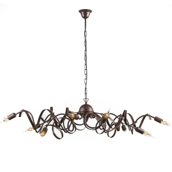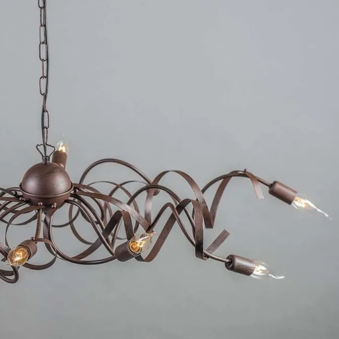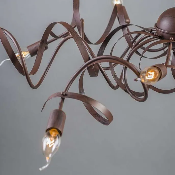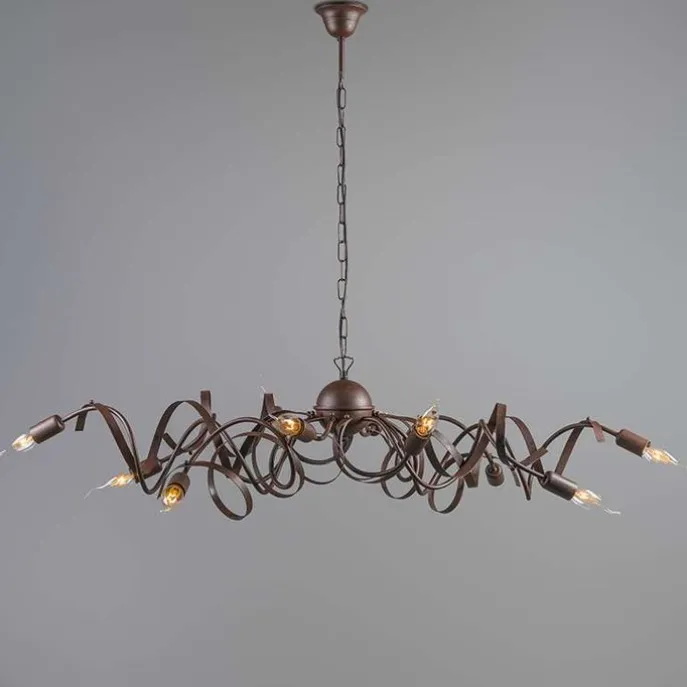 Een rustieke eyecatcher in huis! Deze Ricciolo heeft 10 sierlijke en decoratieve stalen armen. Fijne handgemaakte details die de lamp helemaal afmaken. De ovale vorm van de kroonluchter Ricciolo is zeer geschikt voor een lange eettafel, en het is ook een leuke lamp in bijvoorbeeld de hal.Hij heeft een hoogte van 120 cm en een lengte van 110 cm. De breedte van de lamp is 60 cm. De lengte van het snoer is 90 cm en dediameter van de montageplaat is 9 cm.Let op: deze hanglamp wordt zonder lichtbronnen geleverd. Zorg dus zelf nog voor 10 decoratieve lichtbronnetjes passend in een E14 fitting (elk max. 40 Watt). Je kan de lamp tevens dimmen met een externe dimmer. Een echte sfeerlamp in je interieur.