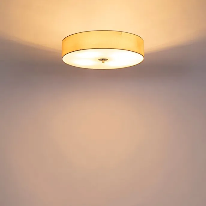Een tijdloze ronde plafonnière met een kap een mooie beige kleur. De stof die gebruikt is voor de kap is gemaakt van katoen. De plafondlamp Drum is prachtig afgewerkt met een matte glasplaat aan de onderzijde waardoor een rustig lichteffect gecreëerd wordt in huis. De lamp heeft een diameter van 50 cm en een hoogte van 13 cm. De lamp is dimbaar met externe dimmer (dimmer niet inbegrepen). Je maakt je Drum compleet met vier lichtbronnen passend in een E27 fitting (elk max. 40 Watt). Een aangename plafondlamp in elke ruimte in huis!