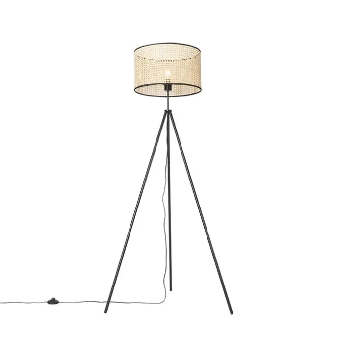Landelijke vloerlamp tripod zwart met rotan kap – Kata