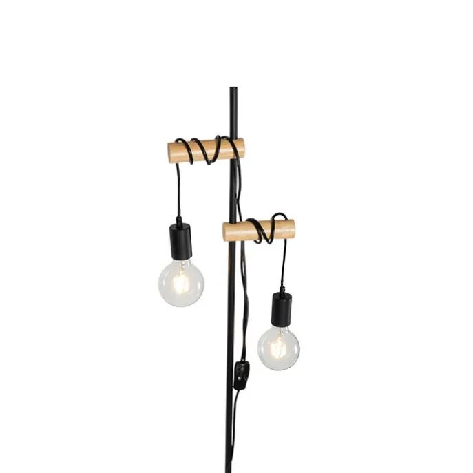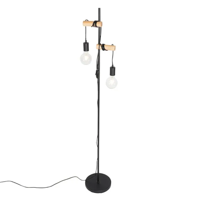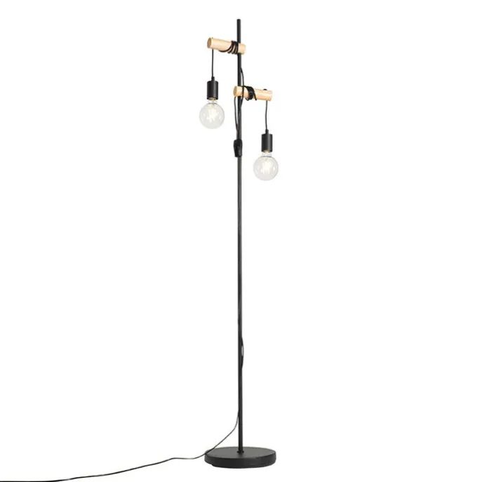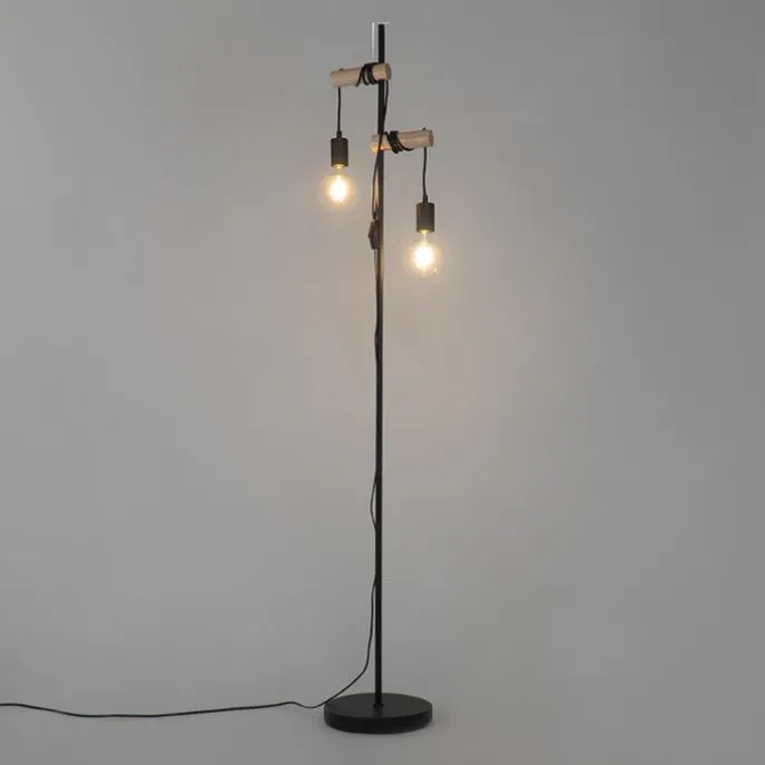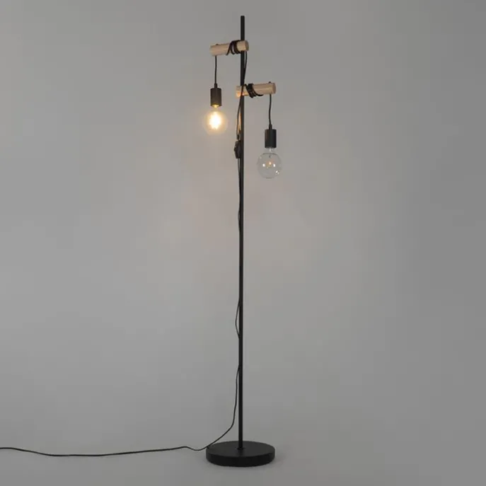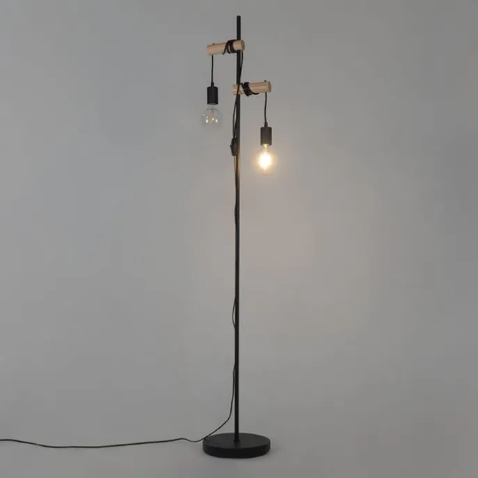 Landelijke vloerlamp zwart met hout 2-lichts – Dami
