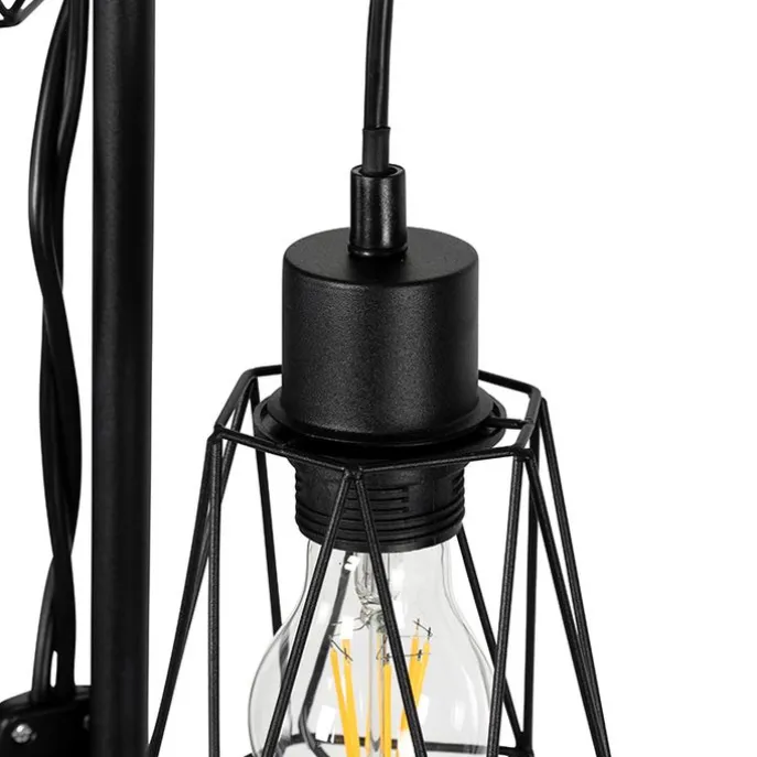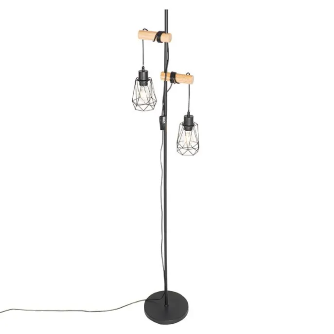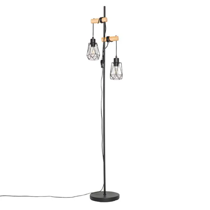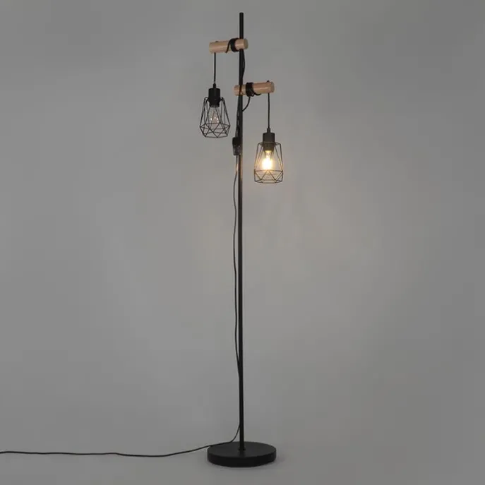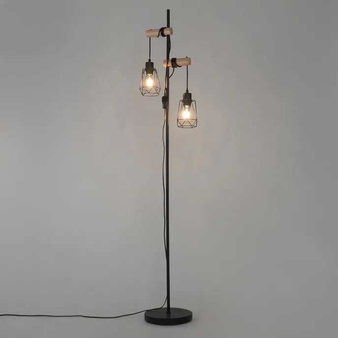 Landelijke vloerlamp zwart met hout 2-lichts met kap – Dami Frame