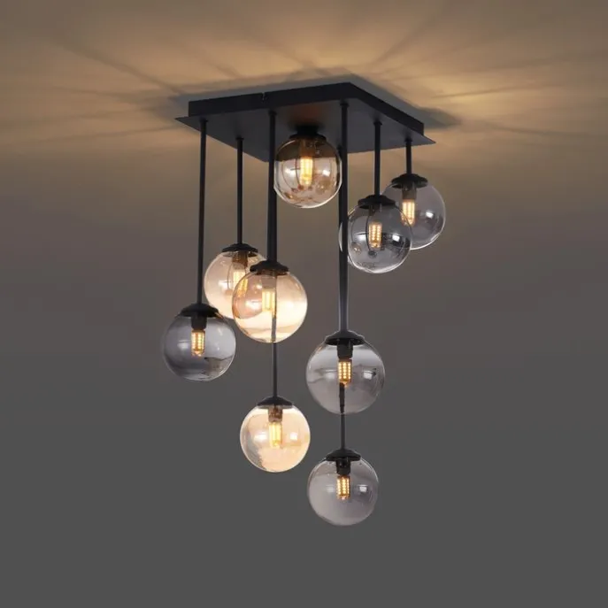 Moderne plafondlamp zwart met amber en smoke glas 9-lichts – Athens