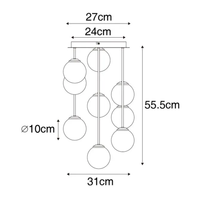 Ben je op zoek naar een moderne plafondlamp voor in huis? Dan is Athens wat je zoekt! Door de 9 verschillende lichtbollen is het een speelse en moderne lamp! Hij is gemaakt van staal met glas en afgewerkt in het zwart. De glazen opale lampenkappen zorgen ervoor dat het licht niet direct in de ogen schijnt, maar dat het licht zich geleidelijk verspreidt door de ruimte. De plafondlamp heeft een breedte van 31 cm, hoogte van 55,5 cm en lengte van 31 cm. De montageplaat heeft een hoogte van 2,5 cm, een lengte van 24 cm en een breedte van 24 cm. Je maakt Athens af met 9 lichtbronnen met G9 fitting van max. 28 watt. Zorg dat je deze er nog los bij besteld. Deze vrolijke plafondlamp past perfect in de woonkamer, eetkamer of slaapkamer!