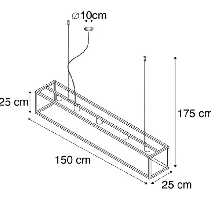 Deze Cage hanglamp is een mooi luchtig ontwerp met een sterk minimalistisch beeld. Je woning of kantoor zal gehuld worden in een geweldige sfeer waar je dagelijks van kan genieten! De open aard van het ontwerp biedt zich perfect om leuke decoratieve lichtbronnen te gebruiken. Maak je Cage dus compleet met 5 lichtbronnen passend in een E27 fitting (elk max. 60 Watt). De lamp is tevens dimbaar met een externe dimmer. Maak het in de avond extra gezellig met de Cage!De hanglamp heeft een totale lengte van 150 cm. De maximale hoogte van de lamp is 175 cm. Hij heeft een breedte van 25 cm. Deze Cage heeft een montageplaatje met diameter 10 cm.Wees een trendsetter en loop voor op de rest.