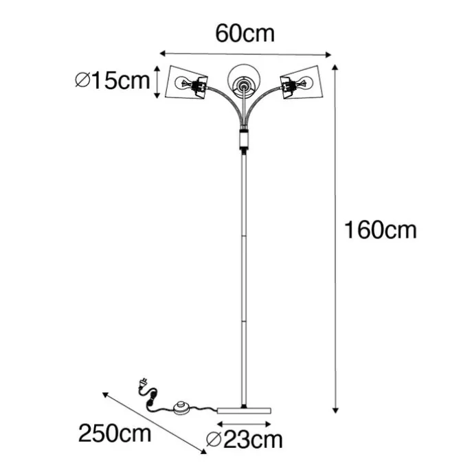Deze stijlvolle sfeermaker zorgt voor sfeervol licht in huis. Deze 3-lichts vloerlamp is afgewerkt in tijdloos zwart. De drie lampenkapjes hebben een gouden binnenkant wat zorgt voor een mooi lichteffect in de woonkamer, de slaapkamer of in de hal. De vloerlamp heeft een hoogte van 160 cm en een lengte van 60 cm. De voet heeft een diameter van 23 cm. Het bijgeleverde snoer is 250 cm lang. Plaats de vloerlamp naast de bank als leeslamp of in de hoek van de de woonkamer om een gezellig plekje te creëren. Je maakt hem compleet met drie E14 lichtbronnen van max. 25 Watt. Let op: lichtbronnen zijn niet inbegrepen en moet je nog apart bij bestellen. Hij is tevens dimbaar met een externe dimmer (niet inbegrepen). Maak het gezellig in huis met onze Carmen vloerlamp!