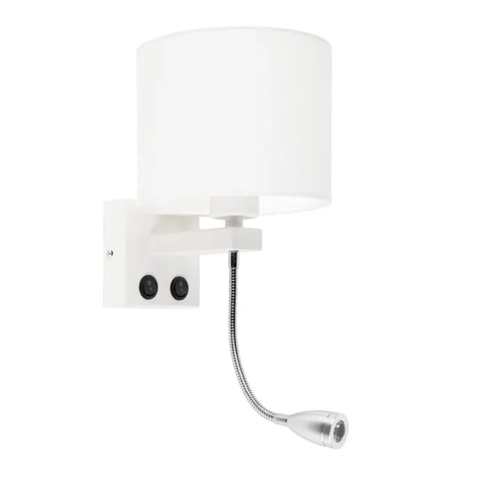 Let’s go modern! Deze wandlamp is perfect om je muur een moderne look te geven. Het is een praktische en stijlvolle wandlamp uitgevoerd in een witte kleur. De charmante wandlamp is zo gemaakt om jou te voorzien van de perfecte verlichtingscombinatie door de ingebouwde leeslamp die je zelf kan verstellen naar jouw zin. De leeslamp beschikt over een geïntegreerde LED 2V module. Met een lichtbron met een E27 fitting tot maximaal 60 Watt maak je de Brescia af. Let op: deze is niet mee geleverd maar kun je eenvoudig bestellen in onze webshop. Deze Brescia is makkelijk te gebruiken dankzij de aan/uit knoppen op de montageplaat van de lamp. Hierdoor is de lamp en de leeslamp afzonderlijk te bedienen. Hij heeft een diameter van 18 cm, en een totale hoogte van 42 cm. De grijze lampenkap in combinatie met wit armatuur is een echte eyecatcher die niet kan misstaan! Perfect als leeslampje in jouw slaapkamer!