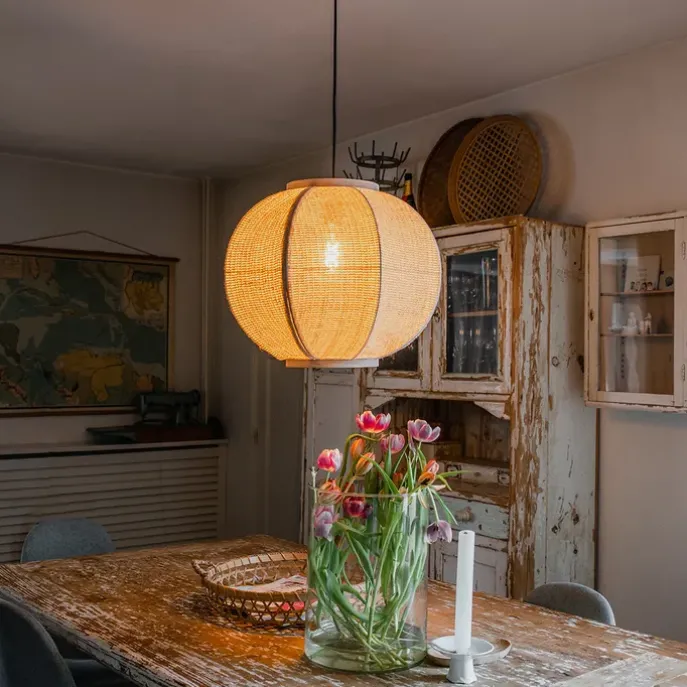 Hanglamp Rob voelt zich helemaal thuis in een oosters interieur. De lamp is gemaakt van stof en is afgewerkt in het wit met een natuurlijke houtkleur. De lamp heeft een diameter van 48 cm en een hoogte van 160 cm. Hij is verstelbaar in hoogte, max. 160 cm en min. 72,5 cm. De montageplaat heeft een diameter van 12 cm en een hoogte van 2,5 cm. Het snoer heeft een lengte van 120 cm. Vergeet niet nog een lichtbron met E27 fitting (max. 60 watt) er los bij te bestellen. Deze wordt er niet bij geleverd. Deze hanglamp is dimbaar, maar een dimmer is niet inbegrepen. Mist jouw interieur nog wat sfeer? Dan is Rob de perfecte keuze.