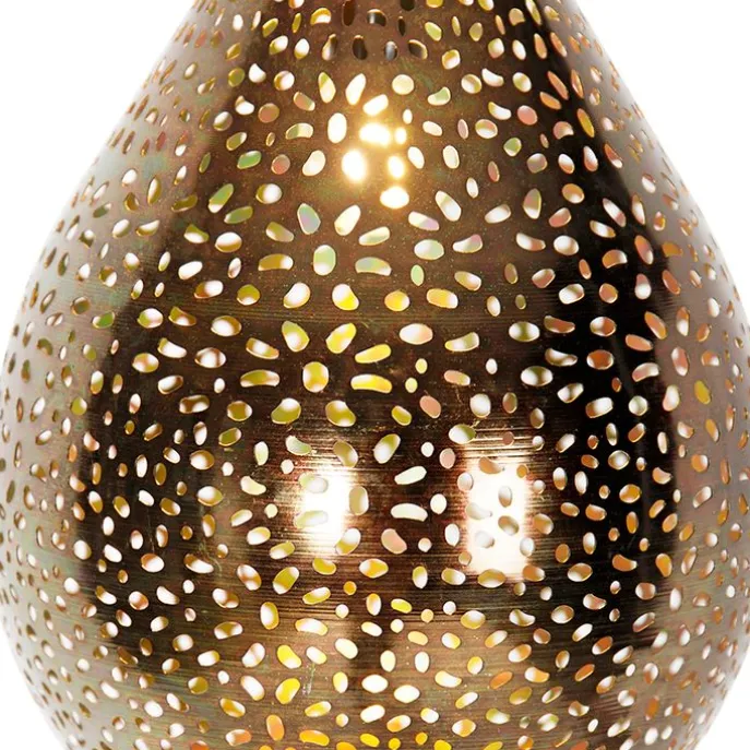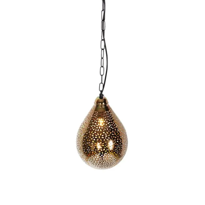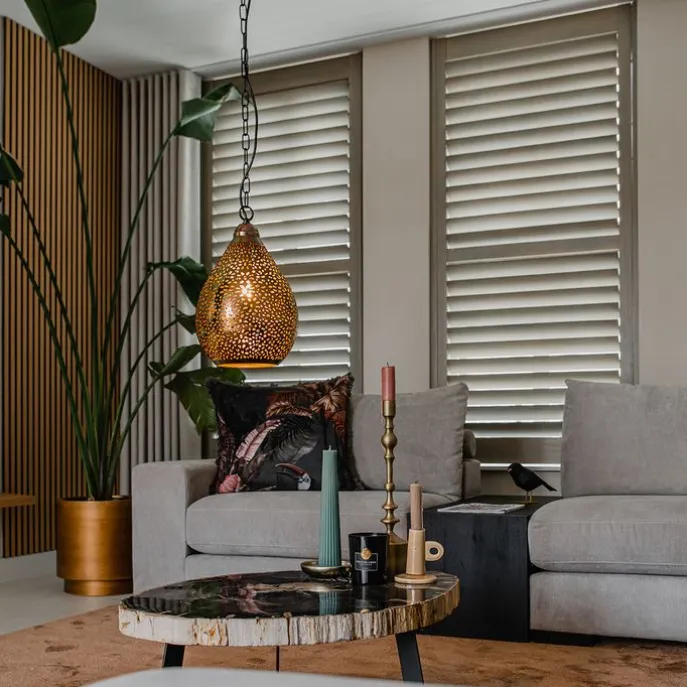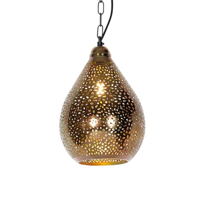 Een mooi afgewerkte hanglamp in koper en uniek design. De open kap zorgt voor een leuke lichtspeling aan het plafond en aan de muur. Het is een echte toevoeging in de eetkamer of in de hal. Ook in de slaapkamer maakt hij het gezellig. De lamp is verstelbaar in hoogte: minimaal 65 cm en maximaal 140 cm. Heel gemakkelijk om de hoogte boven de eettafel te bepalen! In de hal is hij het mooist op zijn maximale lengte. De lampenkap heeft een diameter van 24 cm. Maak je Maruf 5 compleet met een E14 lichtbron (max. 40 Watt). Deze lichtbron is niet inbegrepen. Je kan de lamp dimmen met externe dimmer. Breng een gezellige, Oosterse sfeer in huis met onze Maruf 5!