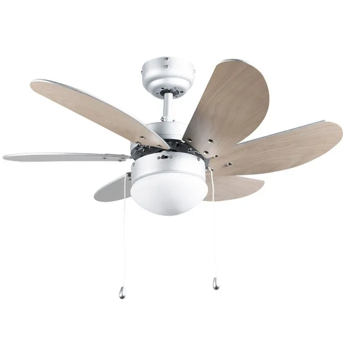 Moderne en stijlvolle multi-functionele plafondventilator met zes bladen afgewerkt in zilvergrijs en hout afwerking. Je kiest zelf welke kant de finishing touch maakt! De Fresh 3 is ideaal voor iedere ruimte waar je een koel en verfrissend briesje wilt, past perfect in een moderne inrichting. De ventilator is voorzien van twee kettingen. Een om het licht te regelen en de ander om de ventilator te regelen. Verder heeft deze Fresh 3 plafondventilator een zomerstand voor verkoeling en een winterstand om warme lucht naar beneden te circulerenMet een breedte van 80 cm is deze ventilator breed genoeg om een goede luchtcirculatie in de door jouw gekozen ruimte te garanderen. De montageplaat heeft een diameter van 16 cm. Met 42.4 decibel is deze plafondventilator stil met een AC motor en zorgt ervoor dat je geniet van een ventilator van hoge kwaliteit en energiezuinige verlichting op hetzelfde moment.De perfecte plafondventilator voor jouw slaapkamer, woonkamer of kantoor voor een verfrissende en koele ruimte. Om de Fresh 3 te laten stralen is er nog een lichtbronnetje nodig van maximum 60 Watt (E14 kleine fitting).