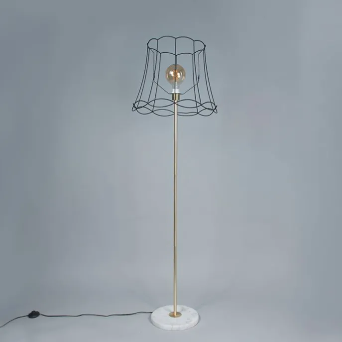 Vloerlamp Kaso is met zijn simpele en strakke design een plaatje opzich. Deze in messing gehulde armatuur is mooi in zijn eenvoud met de marmeren voet. Helemaal in combinatie met de prachtige kap Granny Frame dat het ontwerp heeft van de oude lampenkap van je oma, maar dan is deze nu modieus door het open design van enkel een frame gemaakt van dun metaal draad in zwart gelakt. Door de minimalistische vormgeving is de lichtbron goed zichtbaar, wat helemaal past in de huidige trends. Deze kap past perfect in ieder interieur doordat het iets ouds maar zeker ook iets nieuws en moderns heeft. De lamp heeft een diameter van 50 cm en een hoogte van 175 cm. De voet heeft een diameter van 30 cm. Het snoer heeft een lengte van 200 cm. Je maakt de lamp af met een lichtbron met een E27 fitting (max. 60 Watt), deze moet wel nog los bijbesteld worden. De lamp is dimbaar met een externe dimmer (dimmer niet inbegrepen). Al met al een prachtige klassieke vloerlamp!