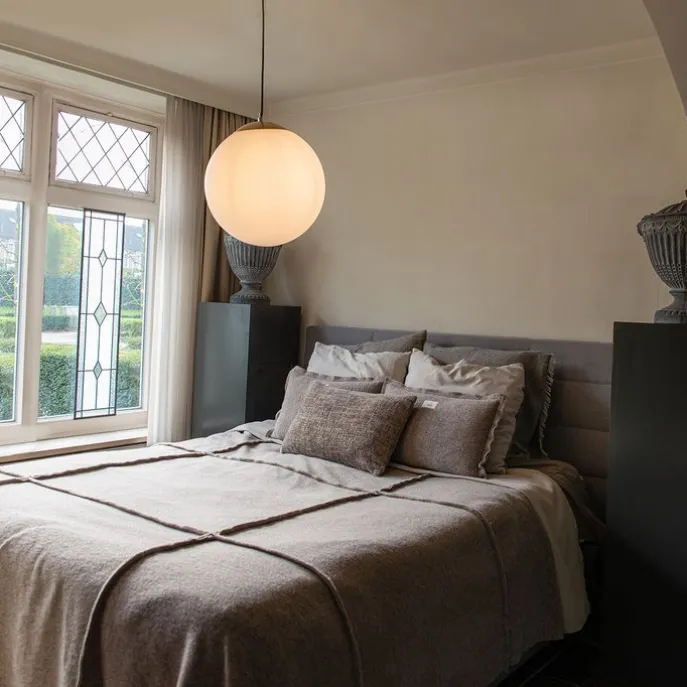 Van een modern tot een Scandinavisch interieur, van hal tot eetkamer: de hanglamp Ball 40 cm komt met zijn strakke en minimalistische design op iedere plek in huis tot zijn recht. Het is een tijdloze hanglamp met een witte glasbol en ophanging van staal in de kleur goud/messing. Hij is in het algemeen 140 cm hoog. De lengte van de ophanging is 100 cm. Het glas van de bol heeft een diameter van 40 cm. Met een E27 lichtbron van maximum 60 Watt kan je hem helemaal afmaken. De Ball is ook dimbaar (dimmer niet inbegrepen) om het in de avond extra gezellig te maken.Tip: combineer met meerdere boven de eettafel.