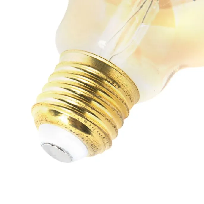 Deze prachtige dimbare E27 LED filament lichtbron heeft een prachtig gold smoke glas wat voor een mooi en warm effect zorgt. De lichtbron heeft een filament wat hetzelfde gevoel geeft als de oude gloeilamp en heeft een doorsnede van 9,5 cm en een hoogte van 13,5 cm. Dankzij de grote opvallende vorm, de zichtbare filamenten en de gouden coating is het een prachtige lichtbron om te zien en hij mag ook best zichtbaar zijn in je armatuur! De lamp is dimbaar, geeft warm wit licht (2200K) en 380 lumen. De lichtbron gaat gemiddeld 20.000 branduren mee. Deze lichtbron is echt een sfeermaker! De perfecte keuze voor iedereen! Nu nog voordeliger als set van 5.
