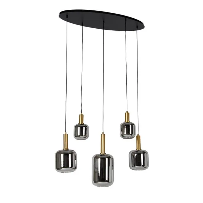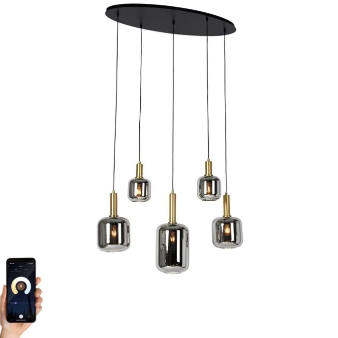 Smart hanglamp zwart met goud en smoke glas ovaal 5-lichts incl. 5 Wifi G95 – Zuzanna