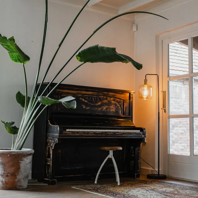 Elegant, stijlvol én slim – Zuzanna is een echte blikvanger voor elk interieur. Deze smart vloerlamp combineert een minimalistisch zwart frame met een warme messing fitting en een sierlijk amberkleurig glazen kap, voor een perfecte mix van modern en vintage. Het glas met subtiele bubbels zorgt voor een sfeervolle lichtspreiding die warmte en karakter toevoegt aan elke ruimte.Dankzij de meegeleverde slimme G95 lichtbron bedien je het licht eenvoudig via je smartphone. Dim het licht voor een intieme sfeer of kies juist voor helderheid tijdens het lezen of werken – alles met één tik.Breng sfeer, luxe en gemak samen met Zuzanna!