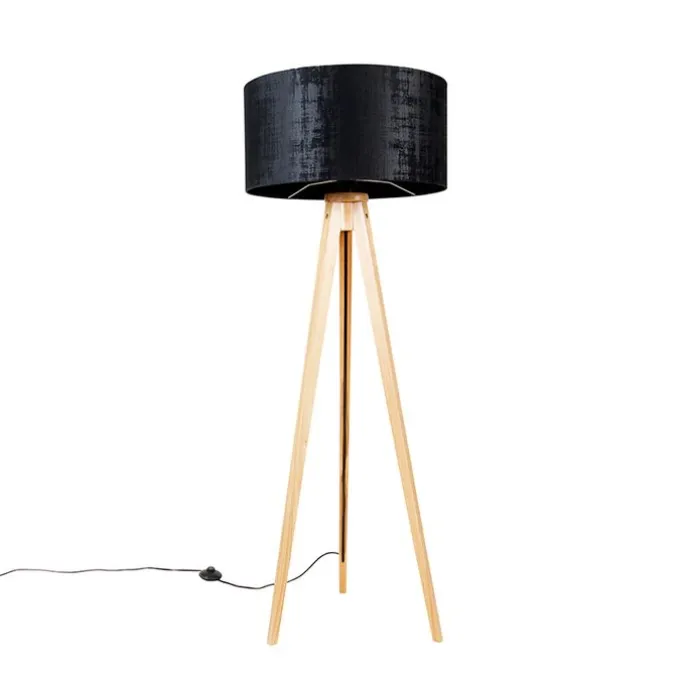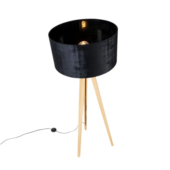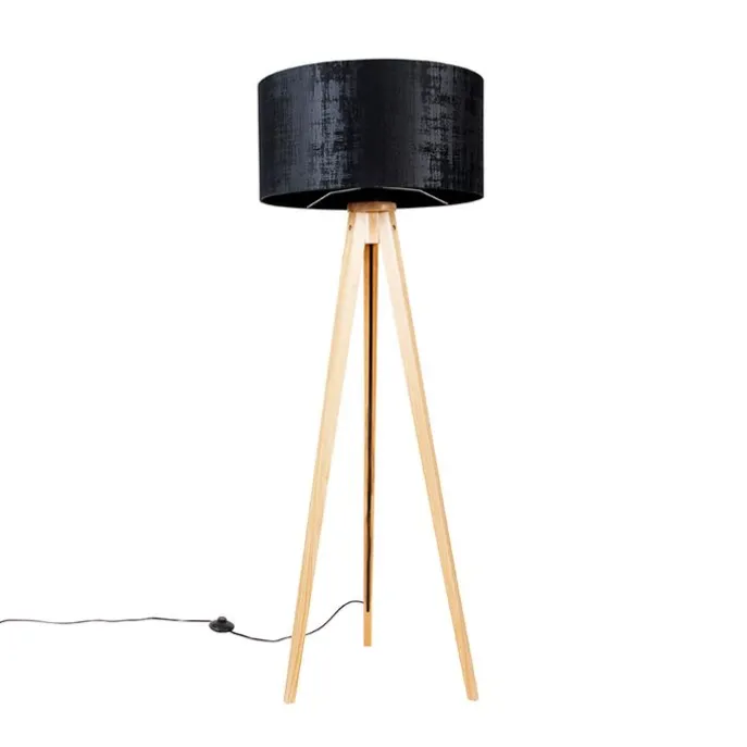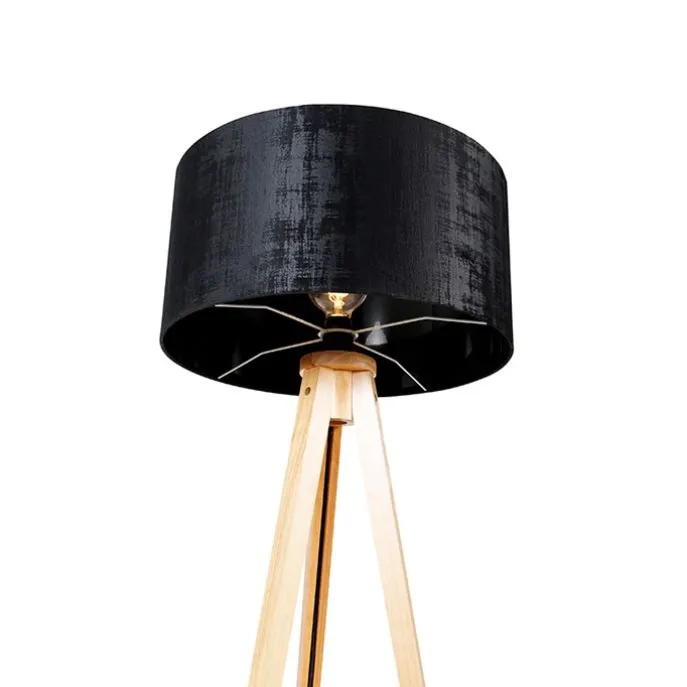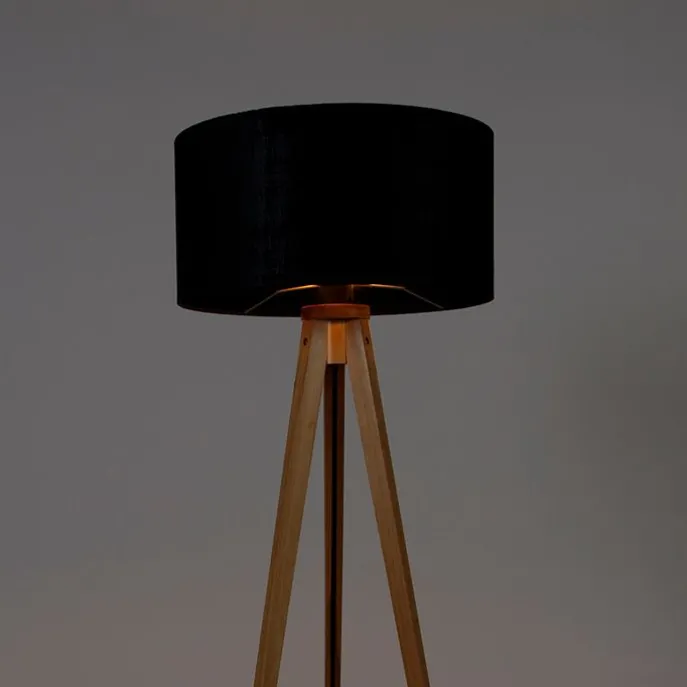 Vloerlamp hout met stoffen kap zwart 50 cm – Tripod Classic