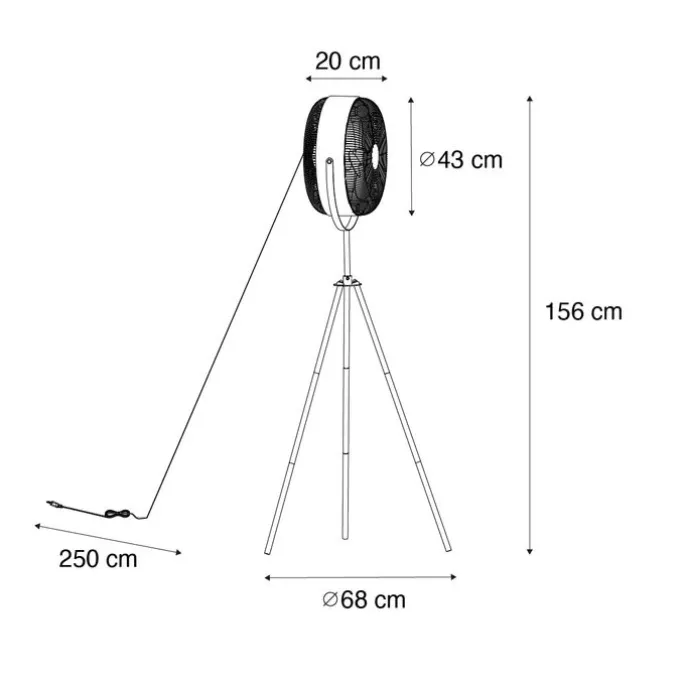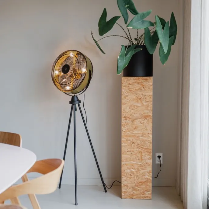 Vloerventilator Kim voelt zich helemaal thuis in een modern interieur. De lamp is gemaakt van kunststof en is afgewerkt in het zwart met goud. Met 4 lichtpunten is deze vloerventilator een uitblinker in elke ruimte. Kim heeft een diameter van 68 cm en een hoogte van 156 cm. Zorg dat je lichtbronnen met E14 fitting erbij besteld om de lamp compleet te maken. Het artikel wordt met snoer en stekker geleverd. Het snoer is 250 cm lang. Deze vloerventilator is dimbaar, maar een dimmer is niet inbegrepen. De vloerventilator wordt geleverd met afstandsbediening, hierdoor is Kim makkelijk te bedienen. Deze afstandsbediening is nog niet voorzien van twee AAA-batterijen. Haal het Hollywood gevoel in huis met vloerventilator Kim!