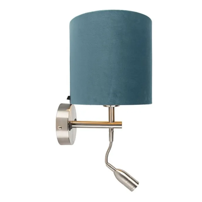 Wandlamp staal met leeslamp en kap velours 20/20/20 blauw